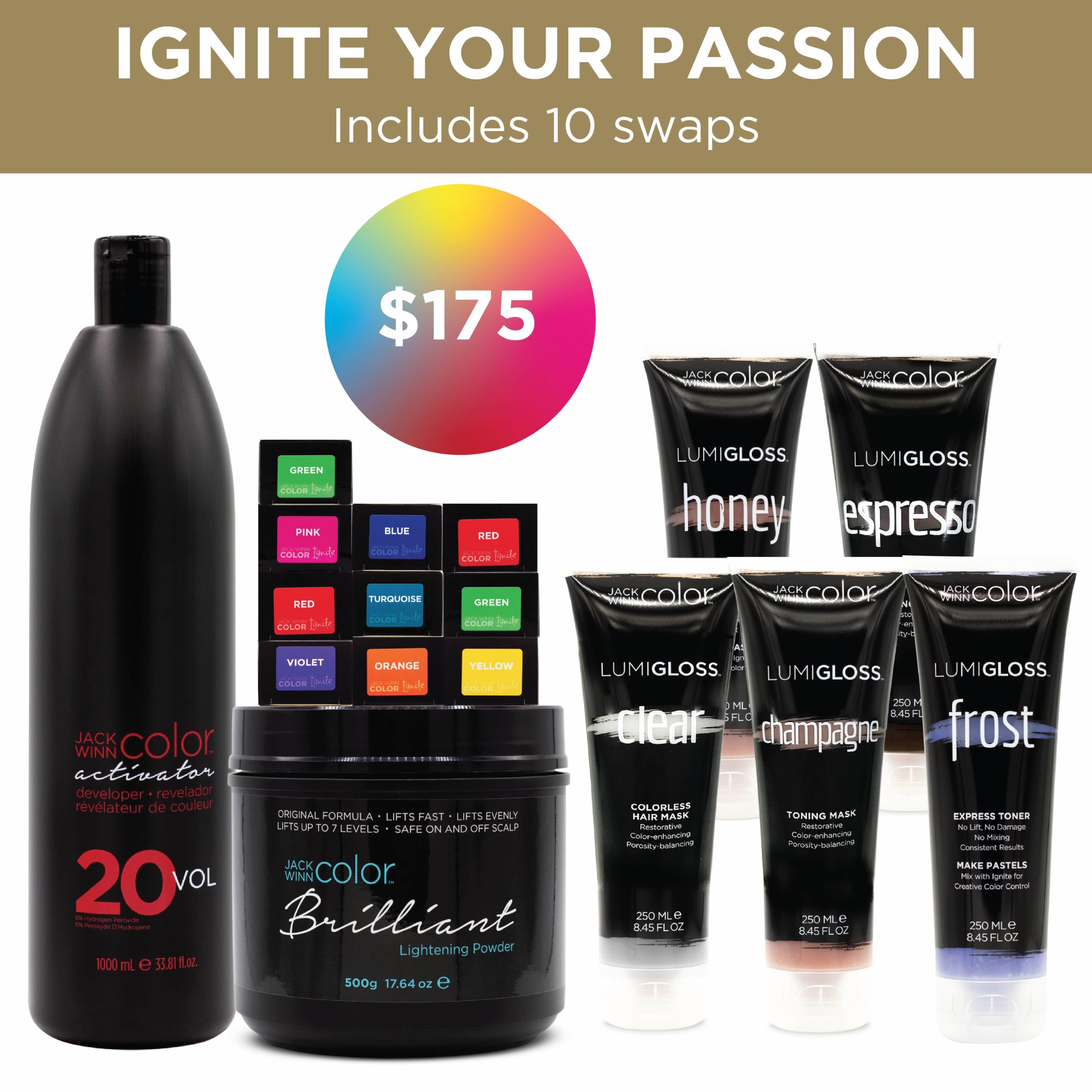 10 shades of Ignite (direct dye), highly pigmented for longevity and works with LumiGloss to create pastel shades and faster fade when your client wants to change colors often.